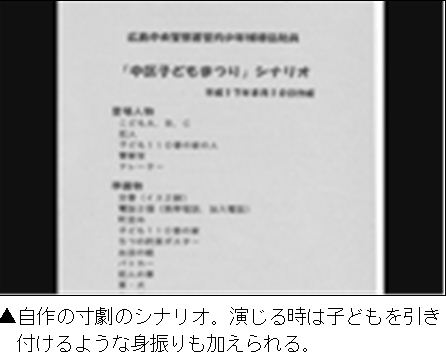 石さん:テキストはありません。教室や体育館に集まっていただいて、12分程の寸劇をします。子どもたちが学校の帰りに寄り道をしてしまい、公園でたまたま一人でいるところを知らない人に声をかけられてしまう。そして連れて行かれそうになる。そこで防犯ブザーを鳴らすと友達が駆けつけてくれて、110番の家に逃げ込むという内容です。